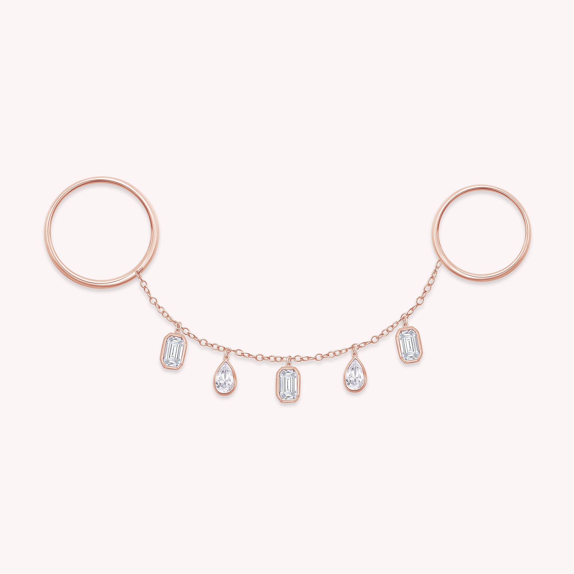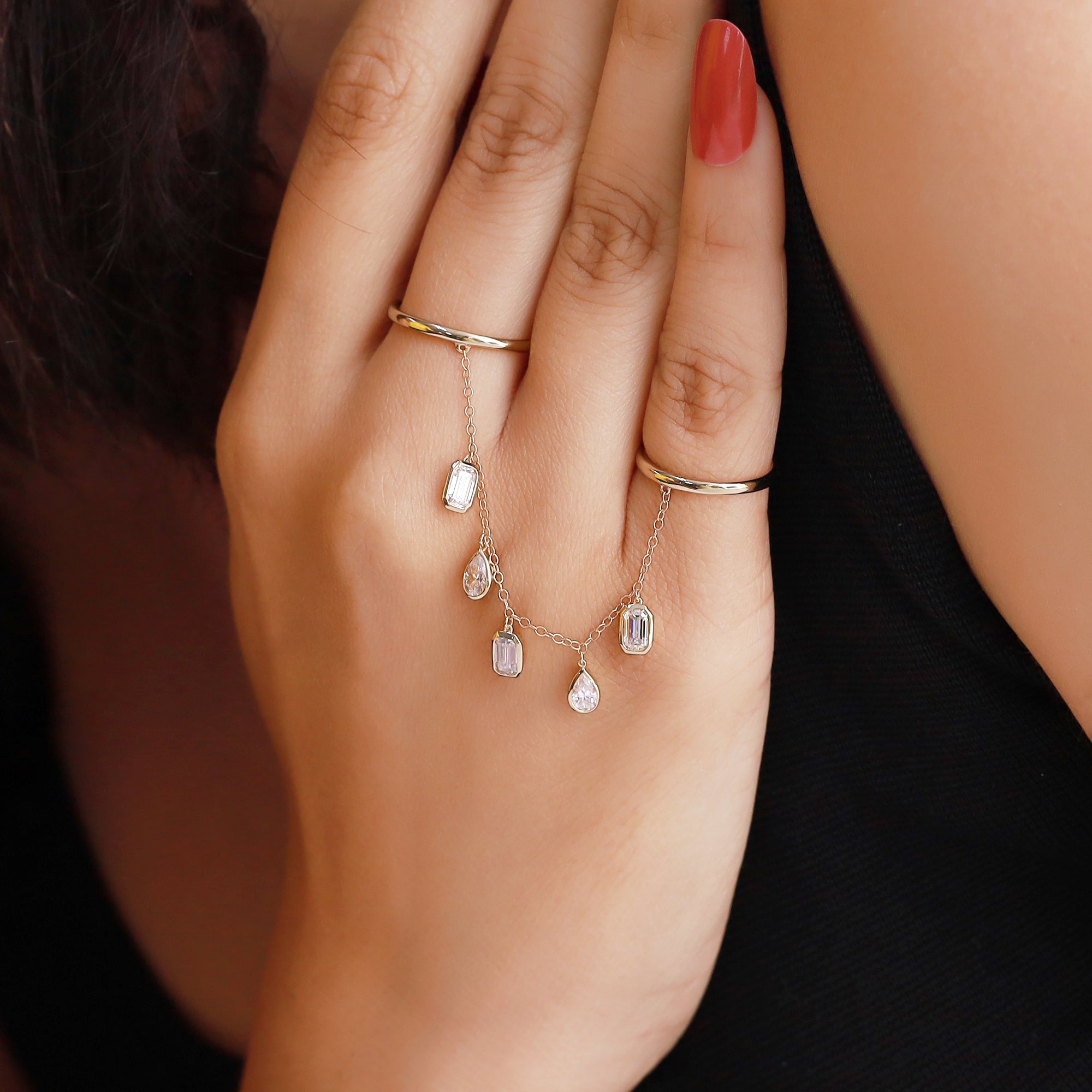 Elevate your elegance with this Two Finger Chain Ring, featuring moissanite-studded bezel diamond accents that catch the light with subtle brilliance. Designed for stacking or wearing alone, the delicate tassel detailing adds refined movement and sophistication. Crafted to connect two fingers gracefully, it offers a modern twist on classic jewelry, perfect for those seeking a bold yet elegant statement piece.