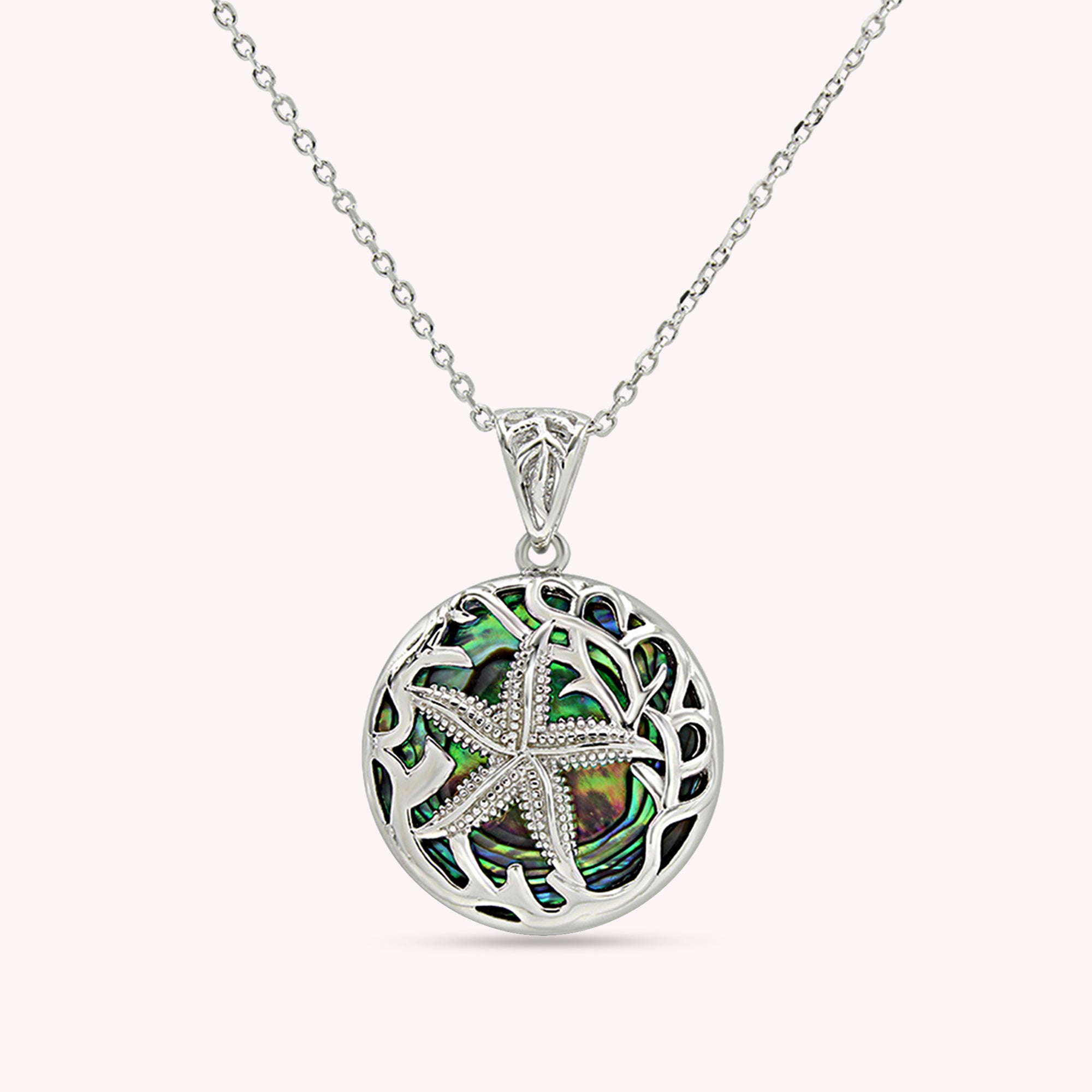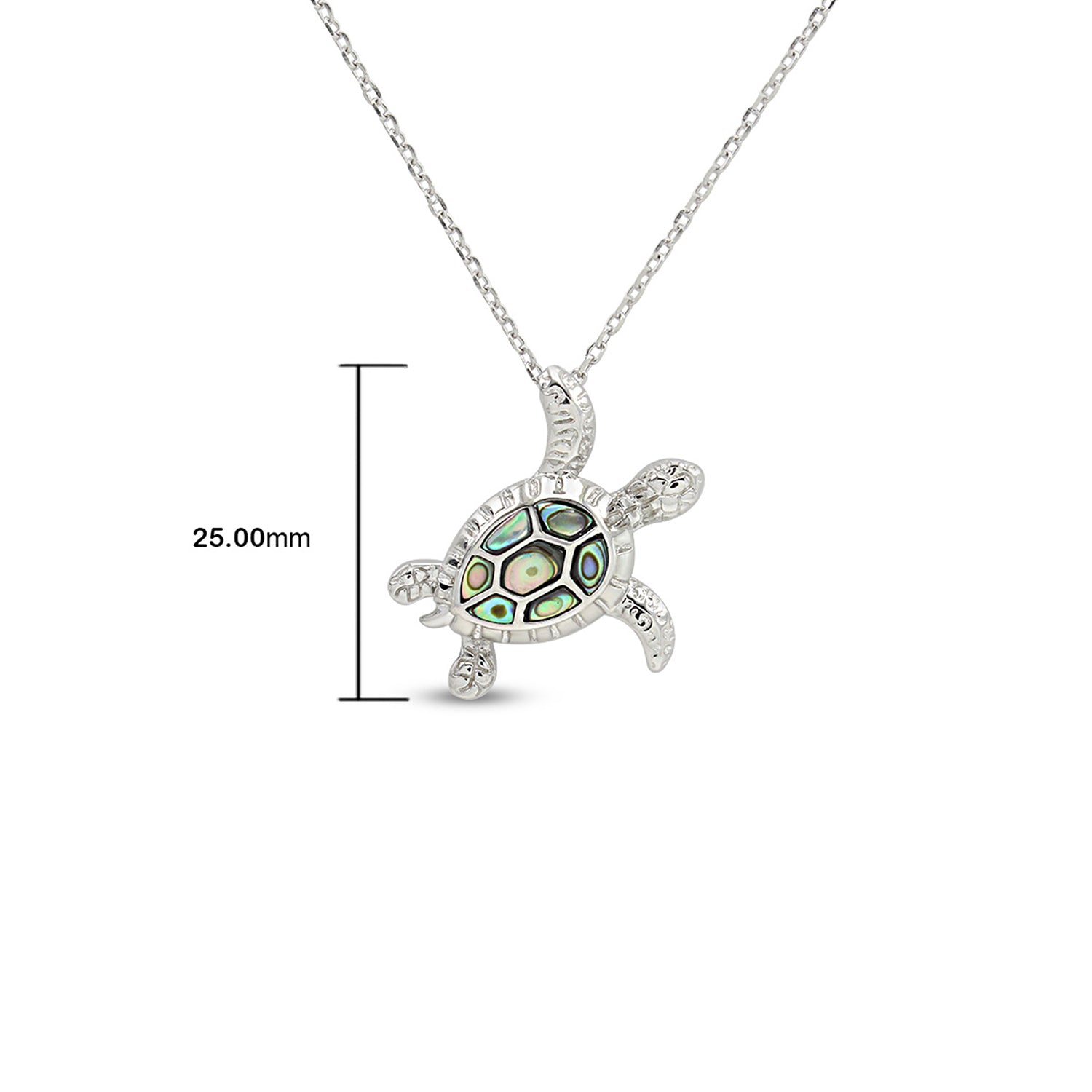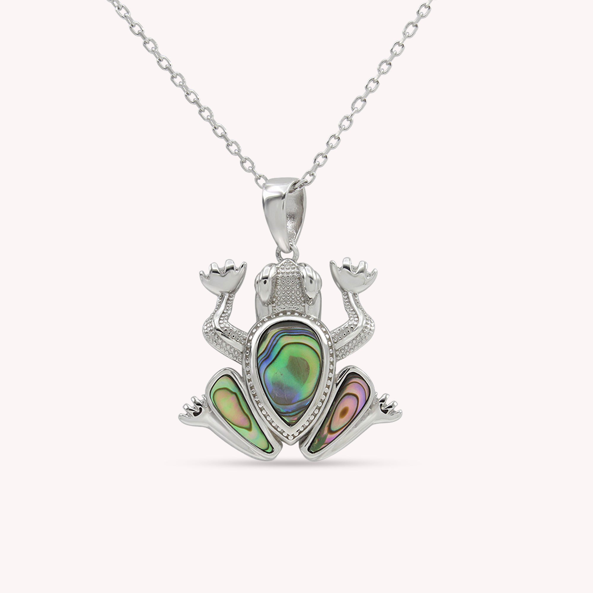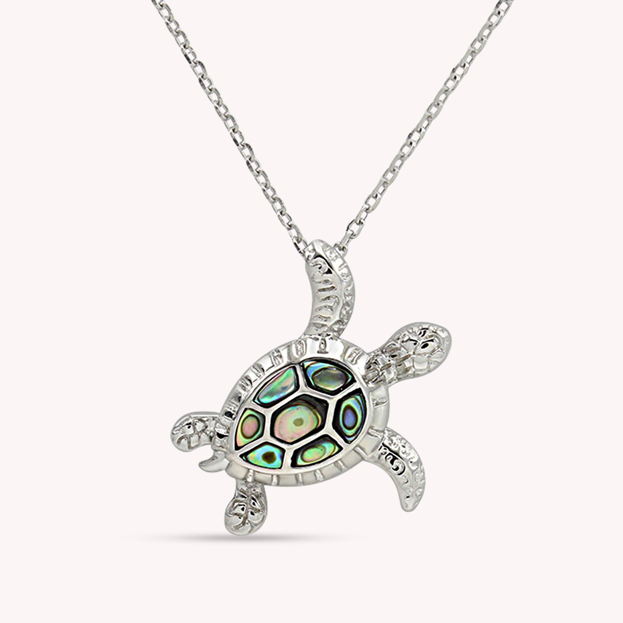 Wear your ocean love with pride with this exquisite abalone shell animal pendant necklace. Crafted in luxurious 14K white gold over sterling silver and featuring a unique shell animal in your choice of a starfish, dolphin, seahorse, frog, dragonfly, whale tail, or turtle, this piece is sure to be the perfect finishing touch to any outfit. Whether a heartfelt gift or a personal indulgence, this stunning pendant necklace will add a touch of elegance and sophistication to any wardrobe.