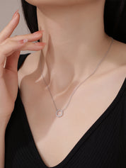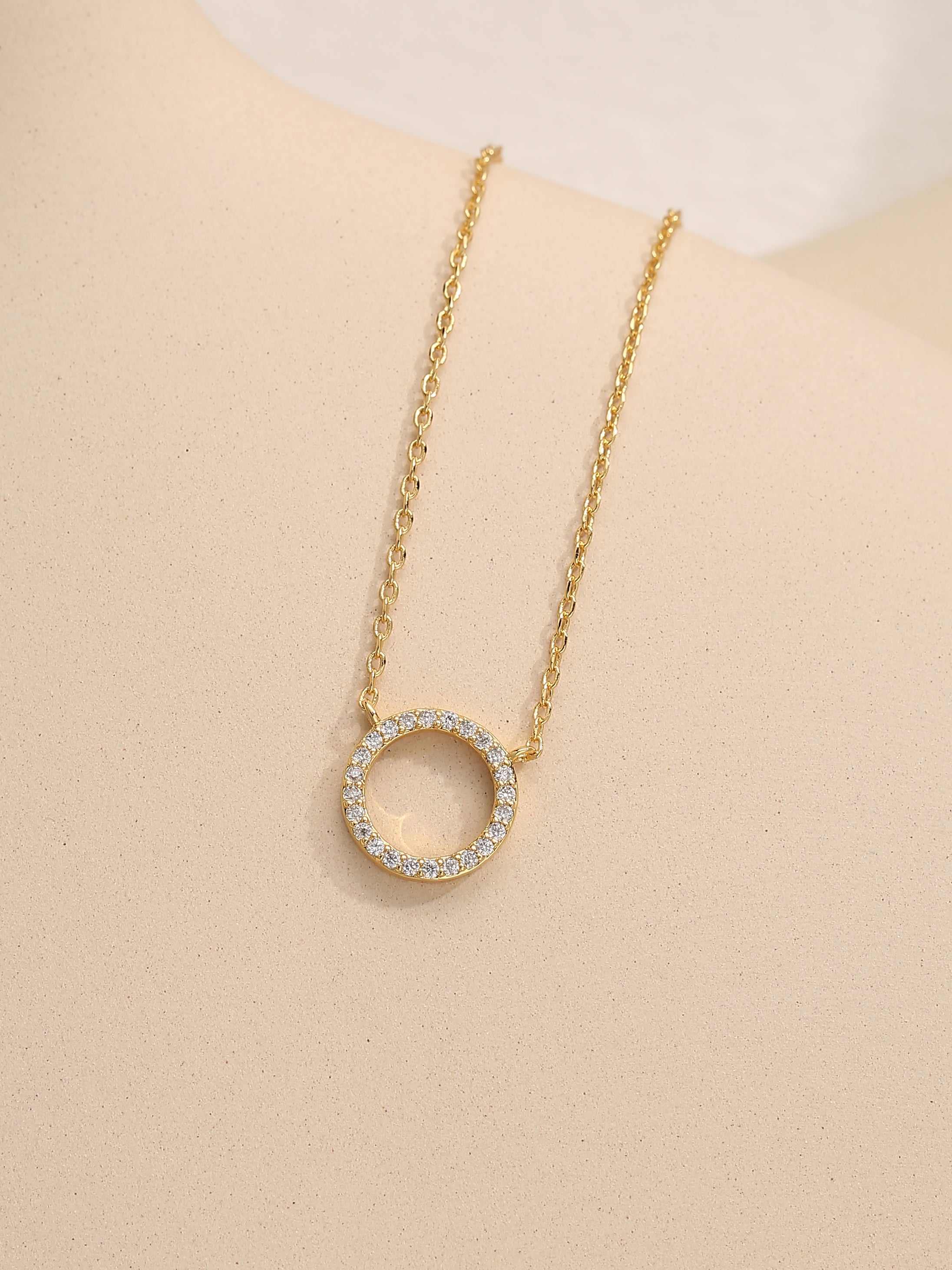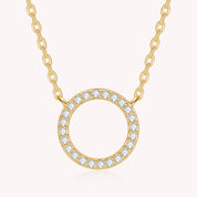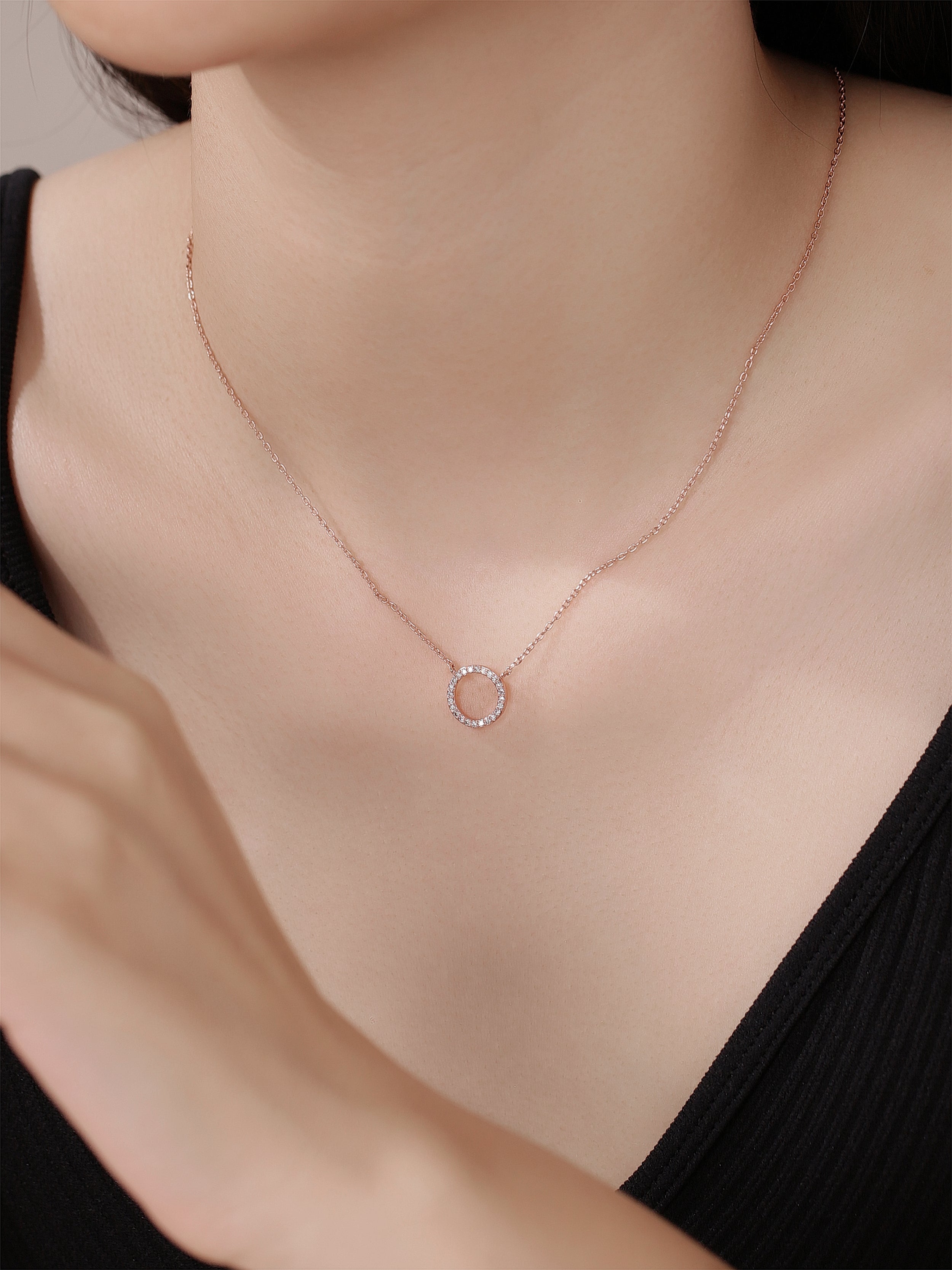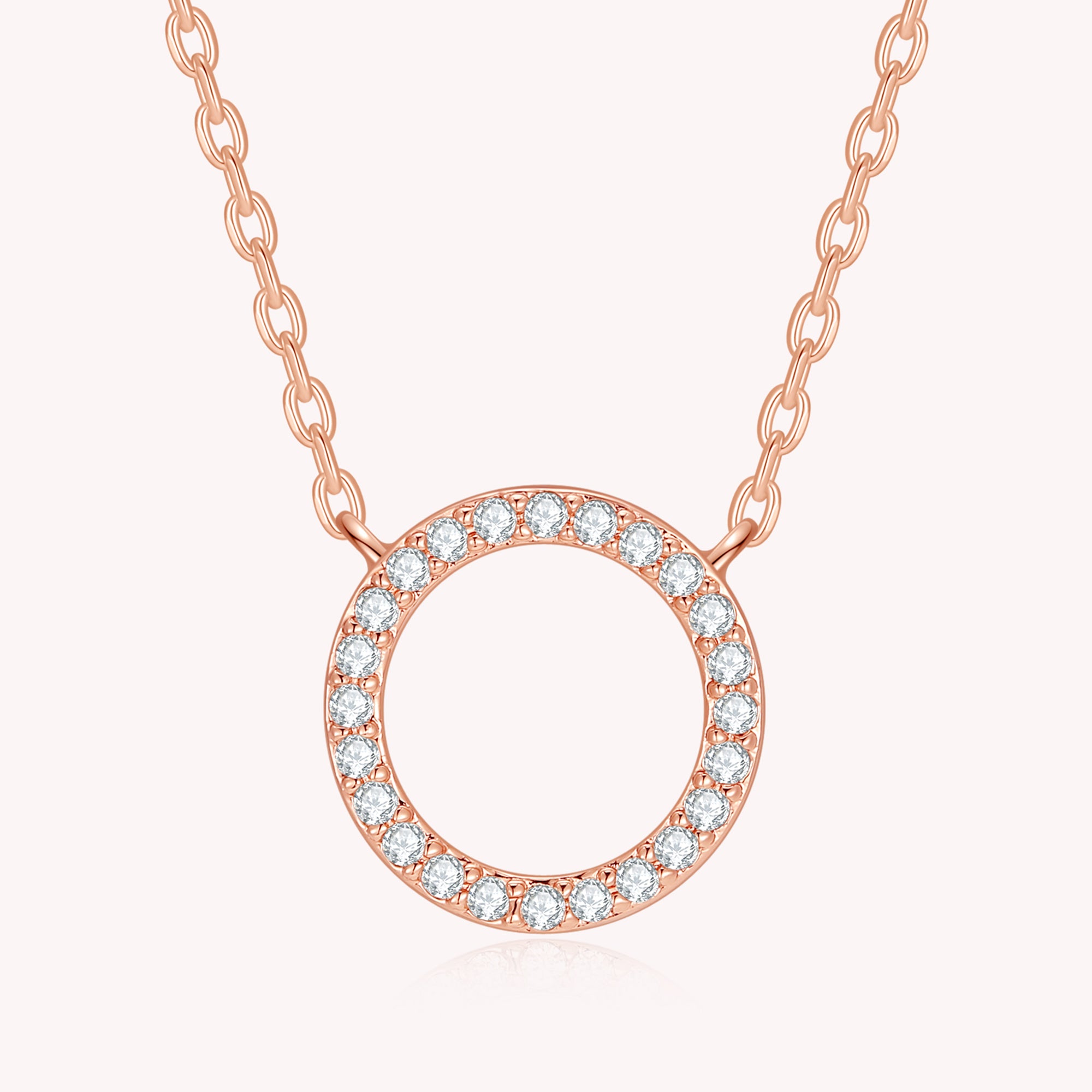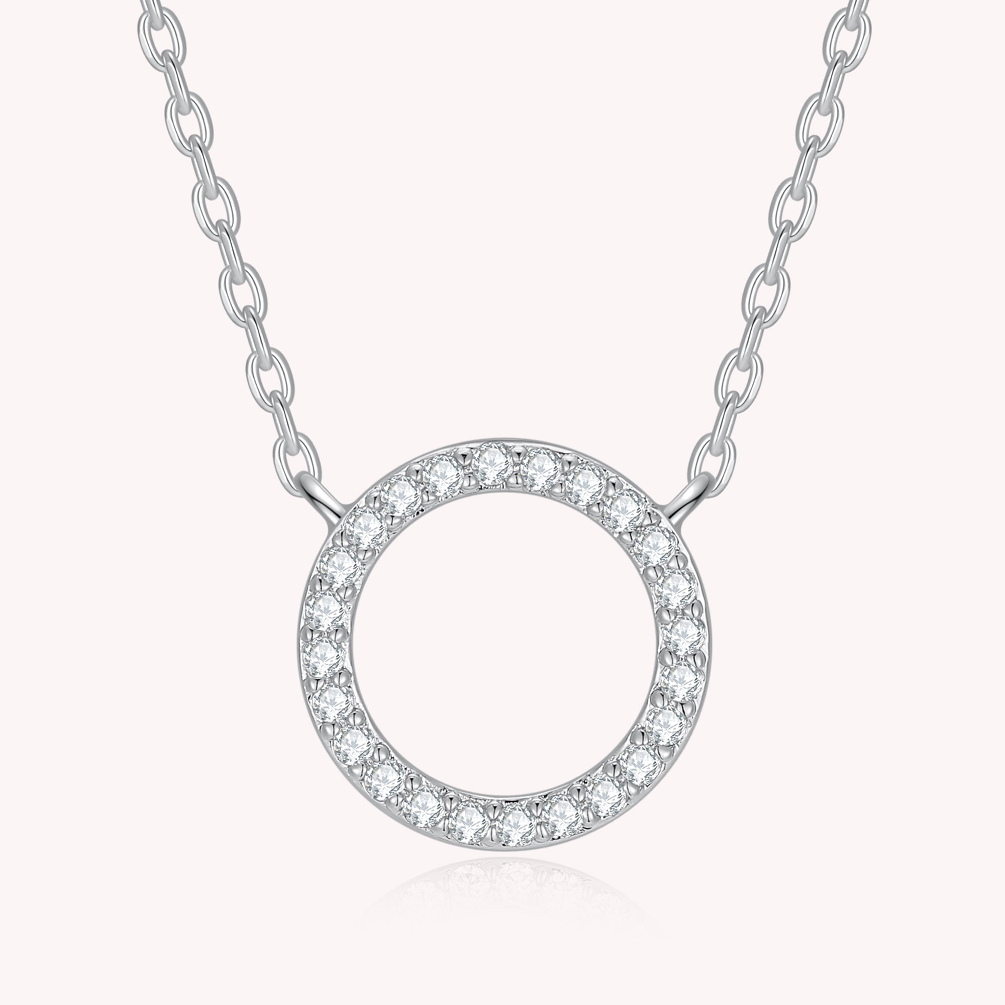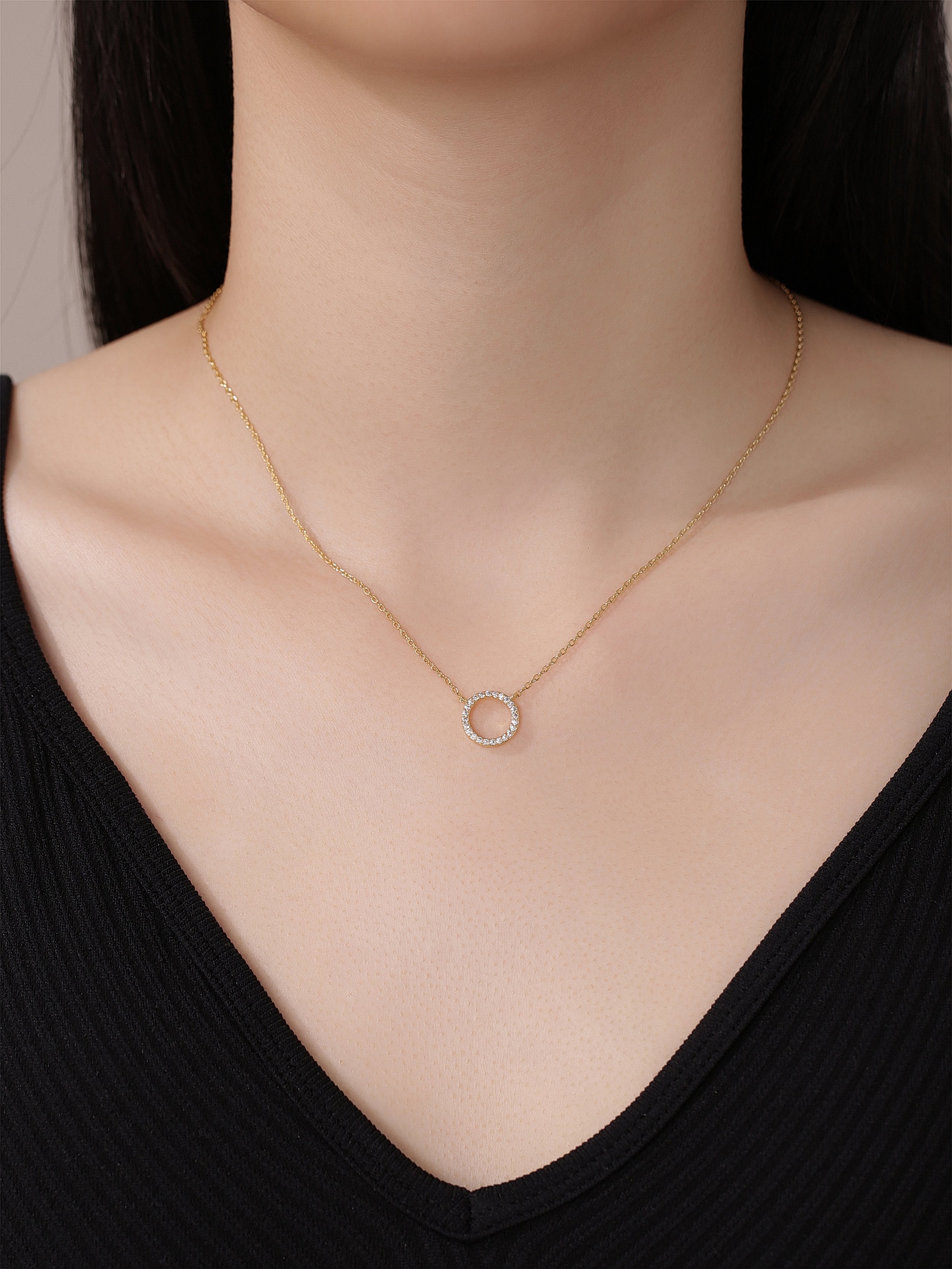 This charming pendant necklace features a gracefully crafted circle adorned with dazzling lab grown diamonds. Its timeless design symbolizes unity and infinity, making it a captivating addition to any jewelry collection.