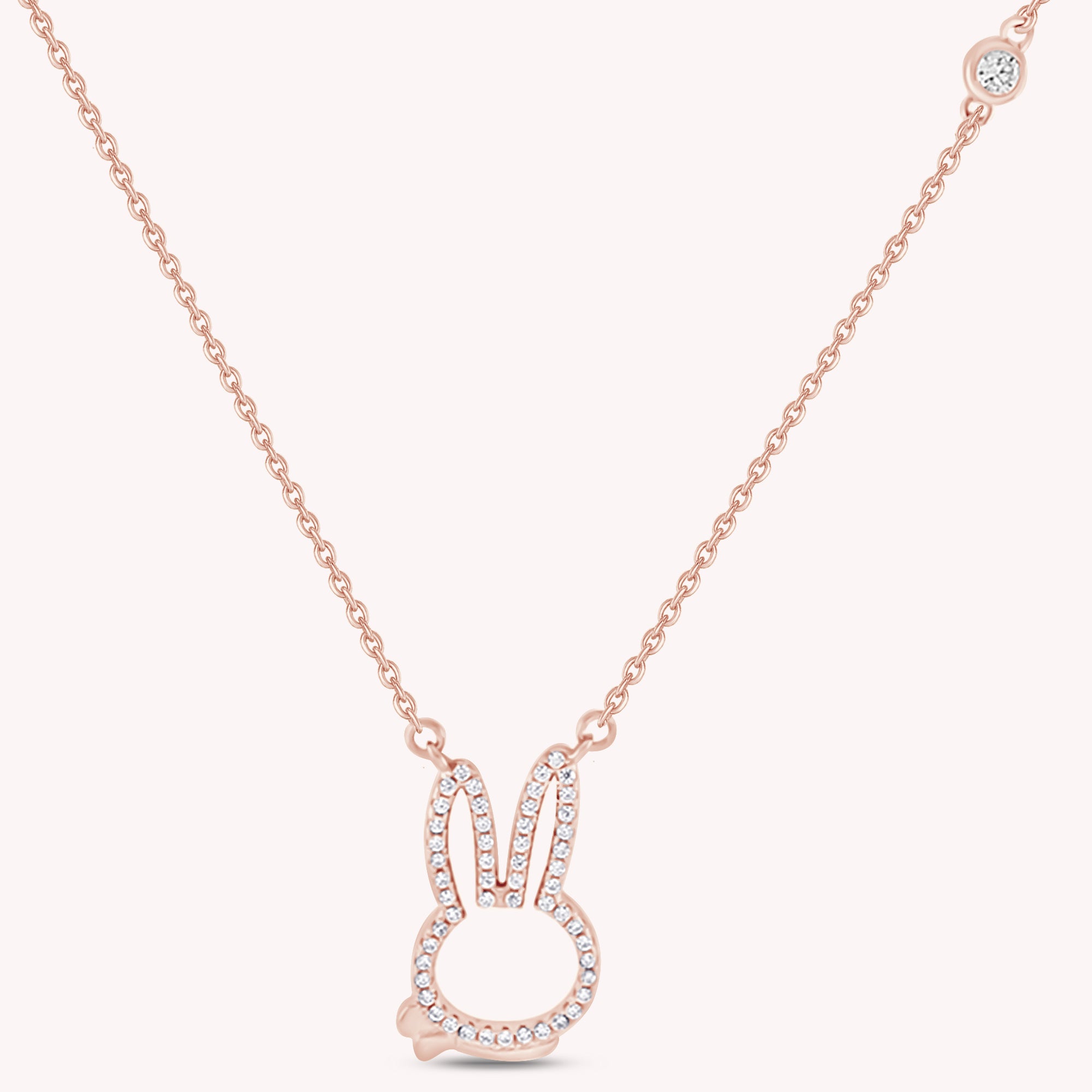 Indulge in luxury with our Easter Bunny Pendant Necklace. Crafted with 14K rose gold over sterling silver and adorned with sparkling white cubic zirconia, this necklace is a statement piece to elevate any outfit. Embody elegance and effortless charm with a touch of whimsy.