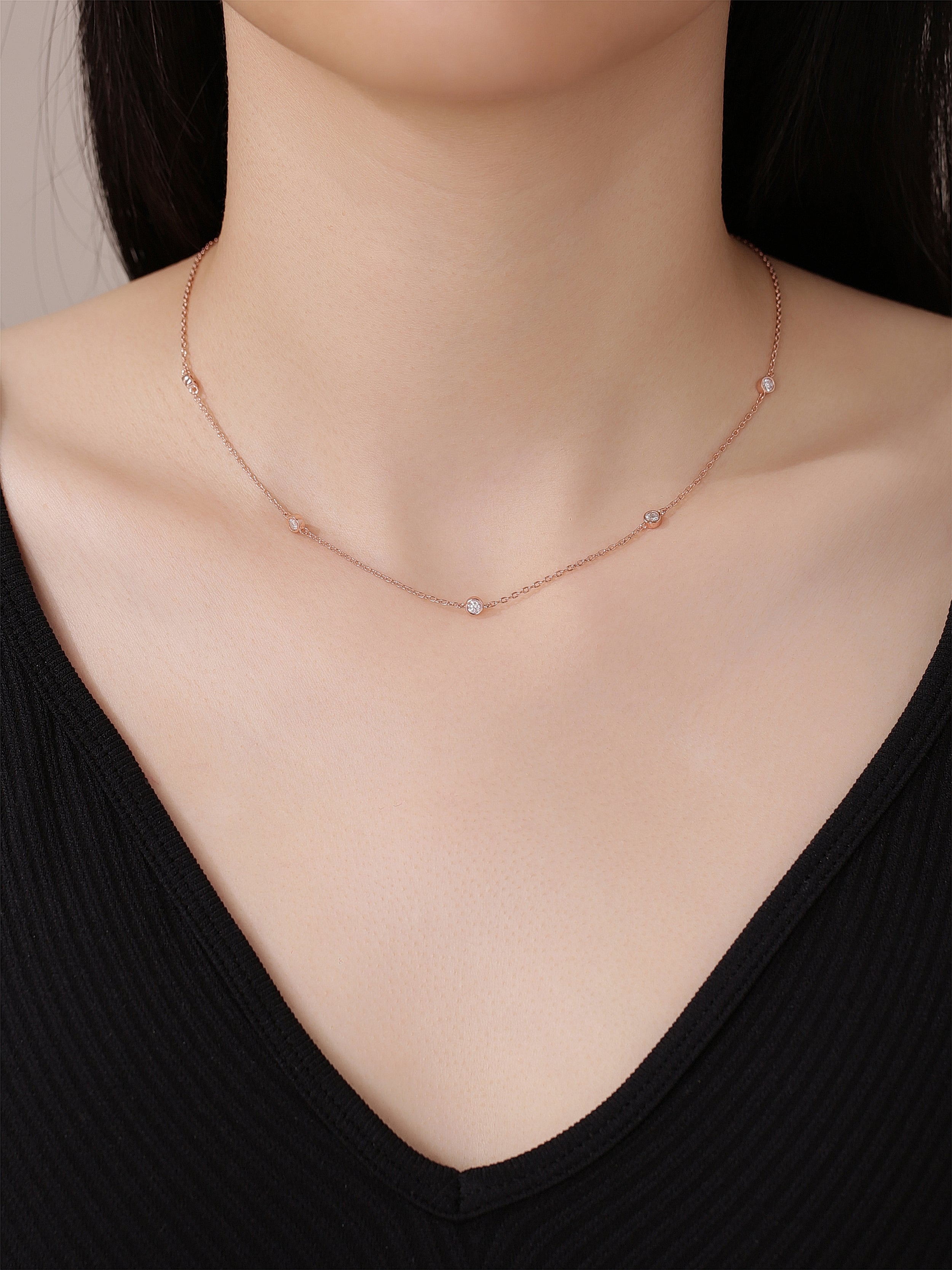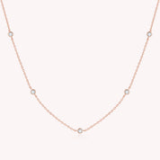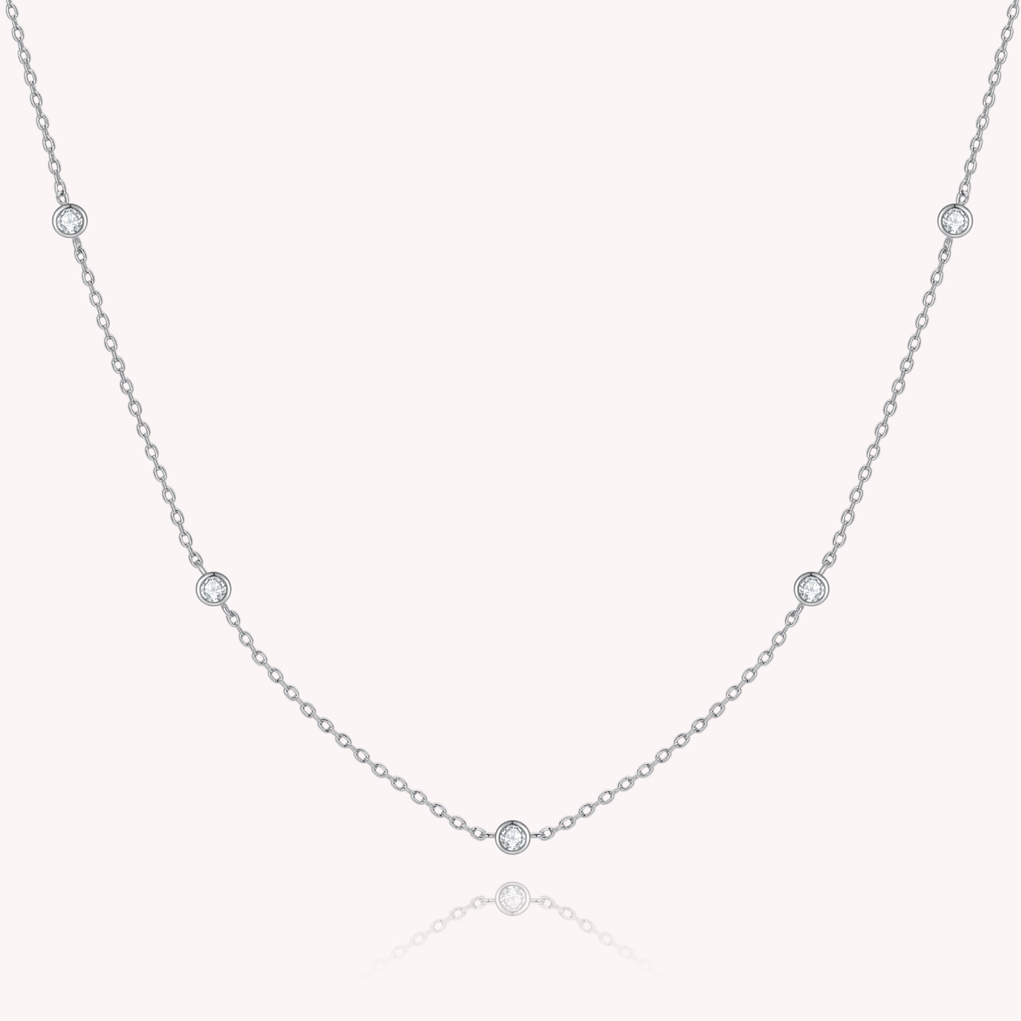 This stunning necklace features five sparkling Moissanite diamonds, elegantly set in a station design that creates a harmonious flow. The arrangement of stones adds a contemporary touch, making it a captivating piece that radiates beauty and charm.