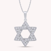 Elevate your style with our Round Lab Created Moissanite Jewish Faith Star Of David Pendant Necklace. Crafted in 925 Sterling Silver, this exquisite necklace features a stunning Jewish faith star of David pendant necklace adorned with 0.72 carats of sparkling moissanite. Make a meaningful statement with this elegant and exclusive piece.