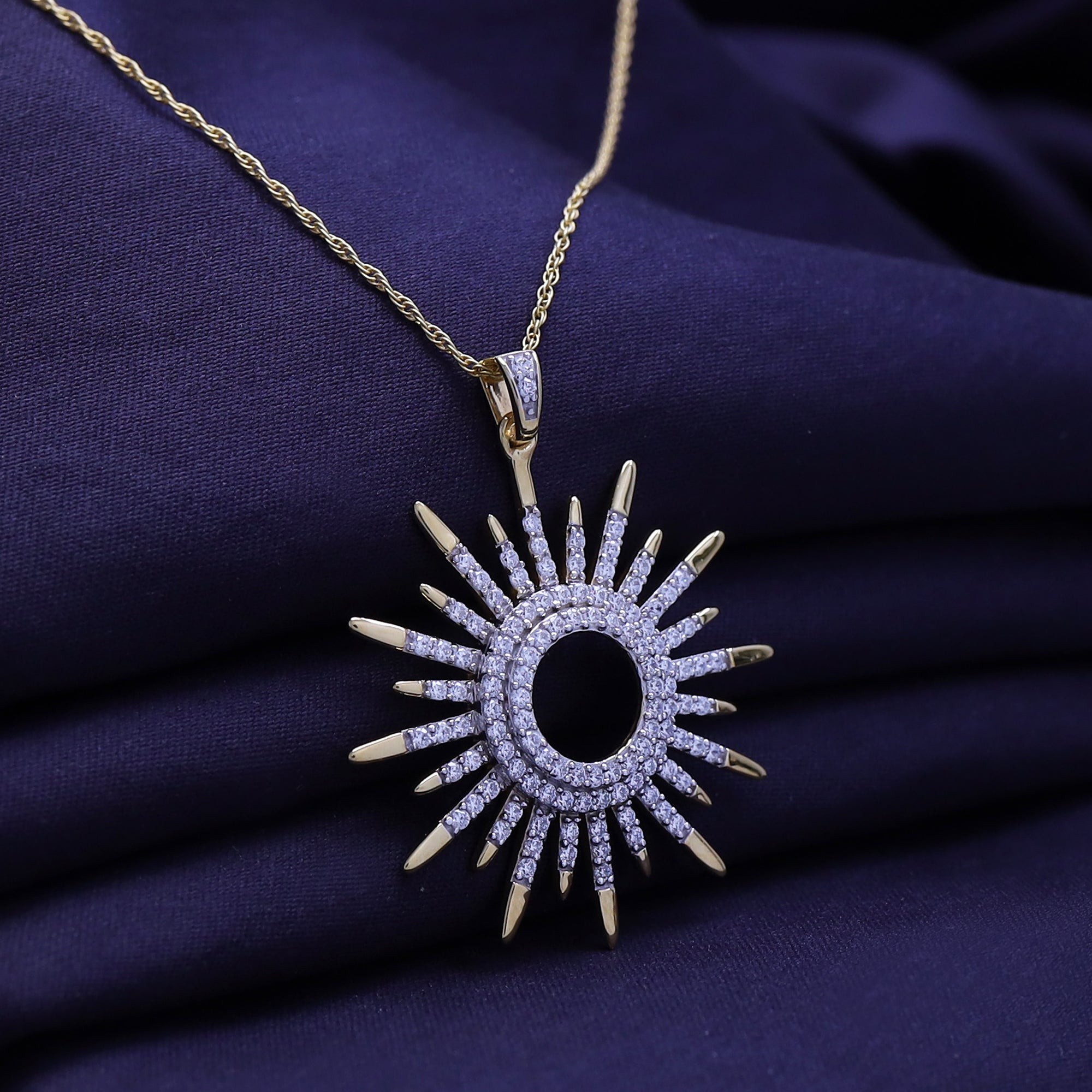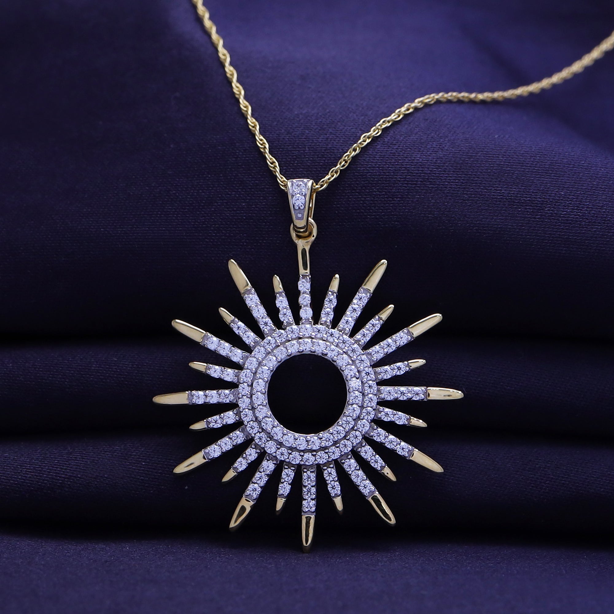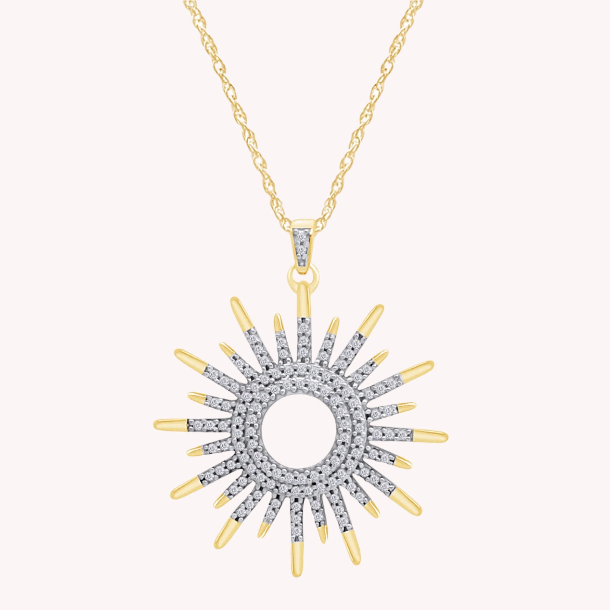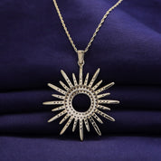 Radiant and eye-catching, the White Cubic Zirconia Sunburst Pendant Necklace captures the warmth of the sun with dazzling brilliance. Its intricate design and shimmering stones make it a beautiful symbol of light and positivity.