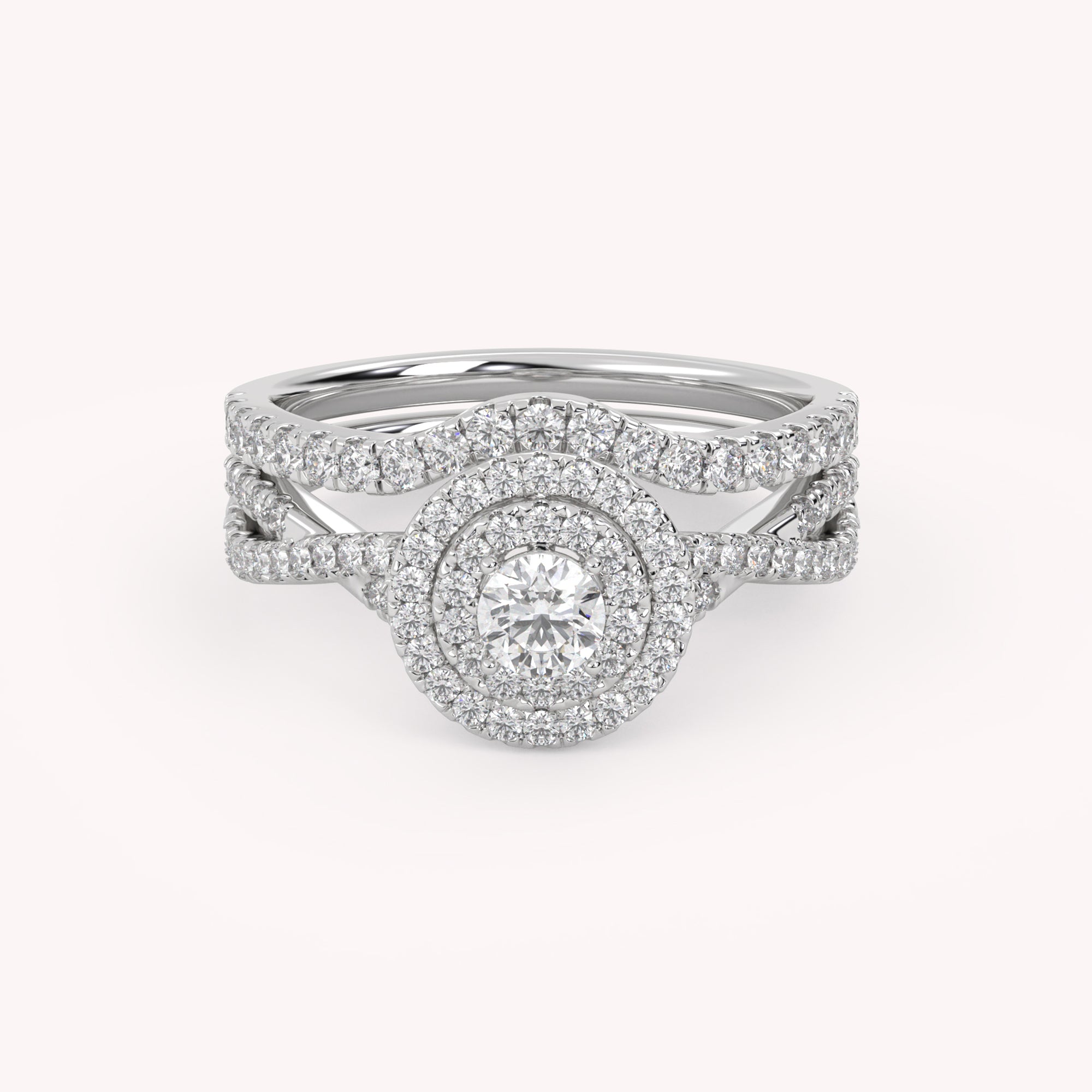 Elevate your engagement with this stunning bridal set featuring a brilliant 0.80 carat lab-grown diamond in a classic round cut. The centerpiece is cradled within a sophisticated double halo design, amplifying sparkle and presence. Twisted infinity bands intertwine gracefully, symbolizing eternal love while adding contemporary elegance to this timeless silhouette. Crafted with precision, this lab-grown diamond offers exceptional quality and ethical sourcing without compromise. The matching wedding band completes the set seamlessly, creating a cohesive, luxurious look that captures both romance and refined style.