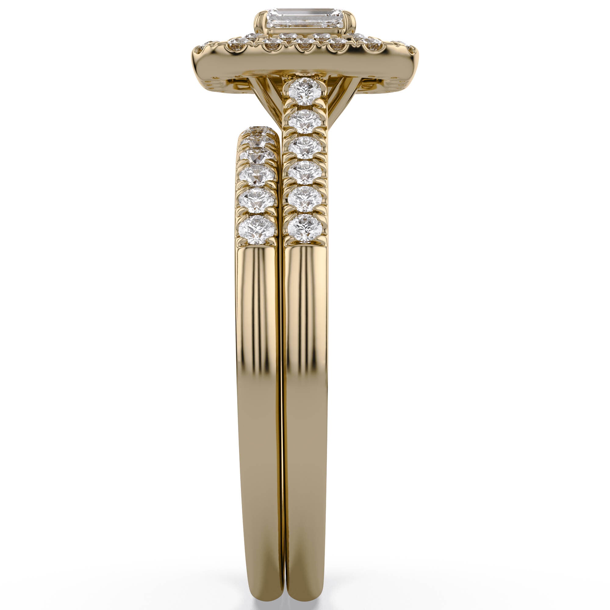 This Double Halo Bridal Set features a total diamond weight of 0.65 carat with a mix of emerald and round cut lab grown diamonds. Each stone is set in a secure prong setting for lasting sparkle. The F–G color and VS–SI clarity diamonds create a balanced and refined look. Made in 14K gold plated 925 sterling silver, this set offers elegance and durability, perfect for special moments or daily wear.