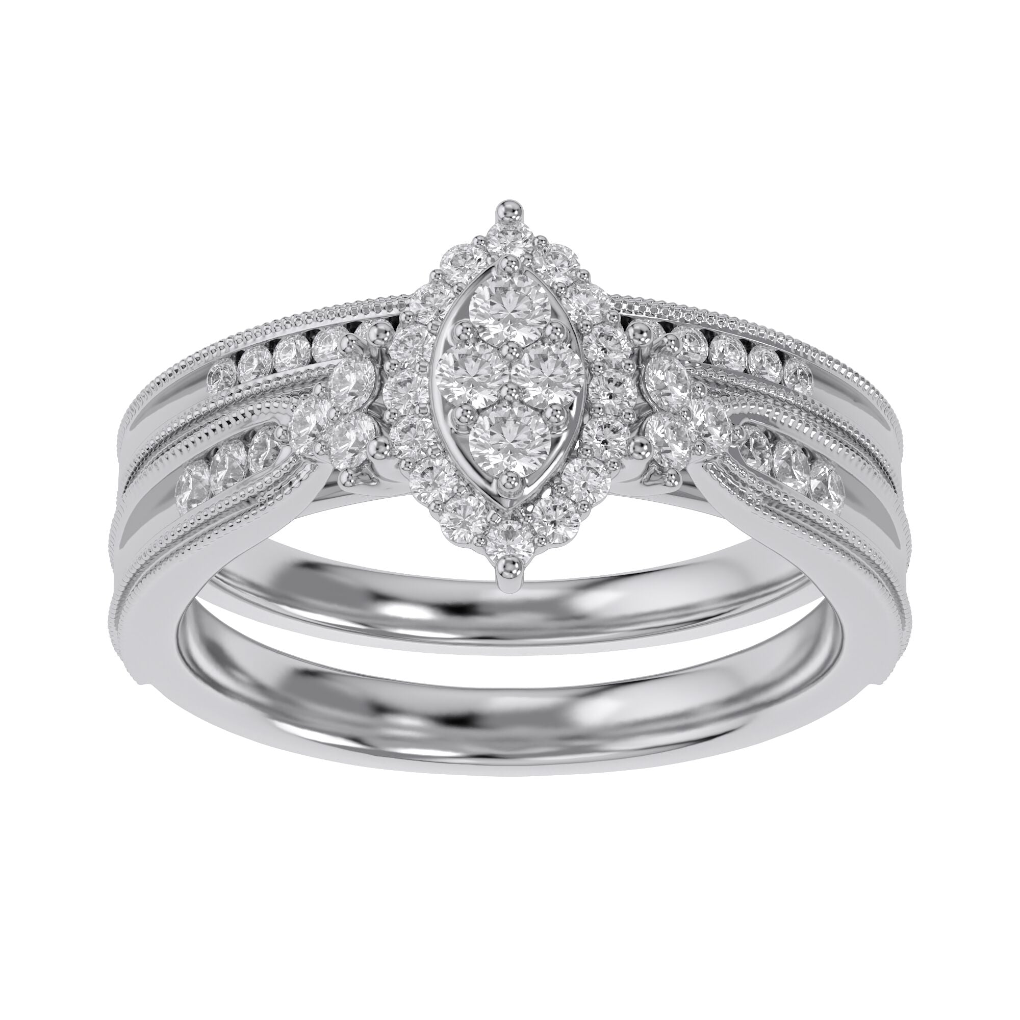 This marquise cut bridal ring set features a refined and coordinated design with a marquise-shaped center accented by lab grown diamonds for added depth and dimension. With a total diamond weight of 0.50 carat (1/2 ctw), the stones are arranged to create a balanced look with subtle sparkle. Crafted to allow light to pass through the stones, the setting supports their natural brilliance while maintaining a secure and structured finish. Made in 925 sterling silver with 14K gold plating, the ring offers a smooth, polished surface and comfortable wear. The matching band sits neatly alongside the main ring, creating a seamless and well-aligned appearance suitable for daily wear or special occasions.