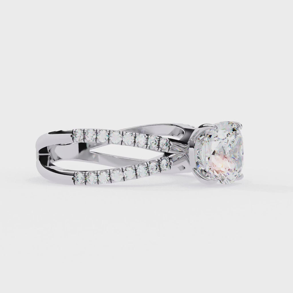 "A cushion cut diamond takes center stage, surrounded by a sleek split shank design. This elegant setting enhances the diamond's soft, rounded edges, creating a perfect balance of modern sophistication and timeless beauty."