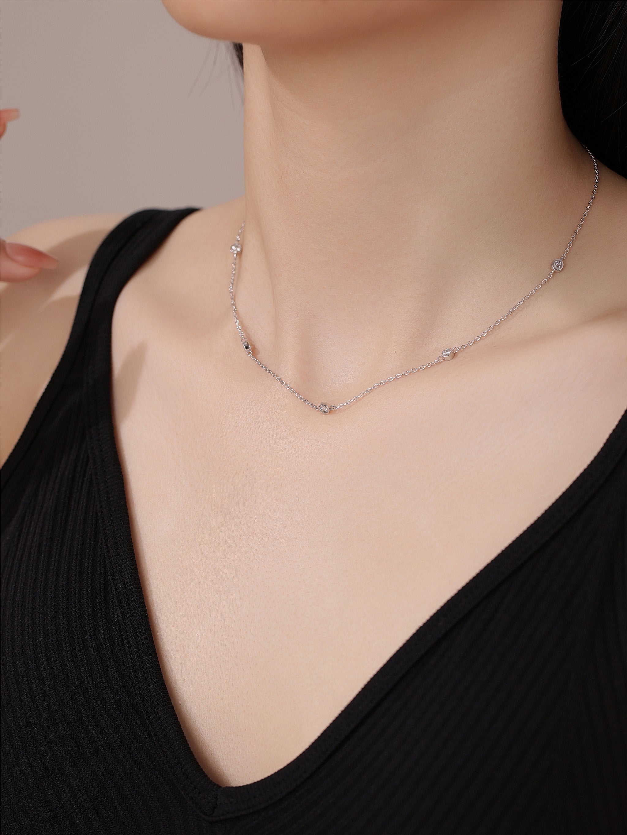 This stunning necklace features five sparkling Moissanite diamonds, elegantly set in a station design that creates a harmonious flow. The arrangement of stones adds a contemporary touch, making it a captivating piece that radiates beauty and charm.